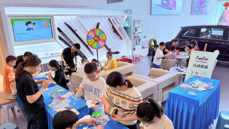活动现场化身为沉浸式环保课堂。在“FunEco”主题背景墙下,广本讲师通过可视化教具生动解析汽车环保科技——展墙悬挂的雨刮器、扰流板等核心部件,配合陈列柜中的环保材料样本,直观传递轻量化设计与再生材料应用对减排的贡献。互动环节更匠心独具:“碳中和知识转盘挑战赛”以“保护环境我们命”“节能减排加油站”等趣味问答激发儿童探索欲;手工区孩子们专注改造旧物,将废弃材料转化为创意艺术品,亲身演绎“零废弃”理念。背景屏幕循环播放《安全用电指南》,强化绿色生活基础认知。